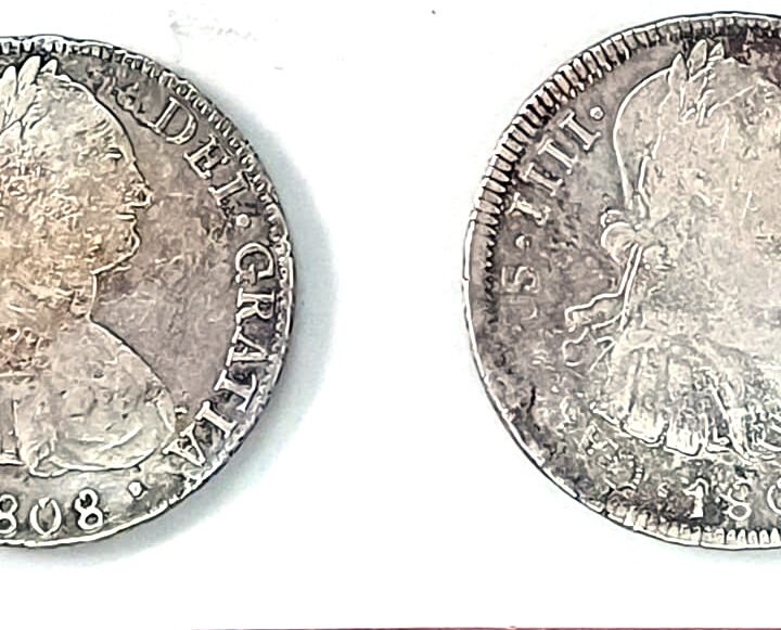 Las monedas de plata de Ley son del año 1803 y 1808, las vendo en conjunto, son monedas de circulación. La Inscripción PJ en ambas las hacen un poco mas raras que las demás de su tipo, la del año 1808 es más buscada por su carisma histórico, siendo este el año del fin del reinado de Carlos IV. Estoy abierto a negociación.